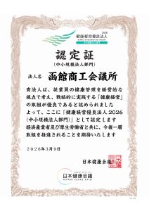 | 令和8年3月9日、本所が健康経営優良法人2026(中小規模法人部門)に認定されました。 健康経営にご関心をお持ちの会員事業所様からのご相談もお受けしています。 企画情報課 TEL23-1181 |