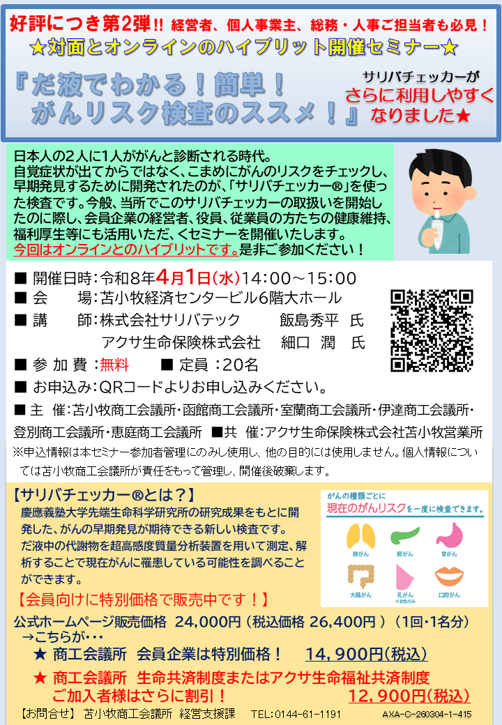 自覚症状が出てからではなく、こまめにがんのリスクをチェックし、早期発見するために開発されたのが、「サリバチェッカーⓇ」を使った検査です。会員企業の従業員の皆様の健康維持、福利厚生等に活用いただくセミナーを開催いたします。是非ご参加ください!